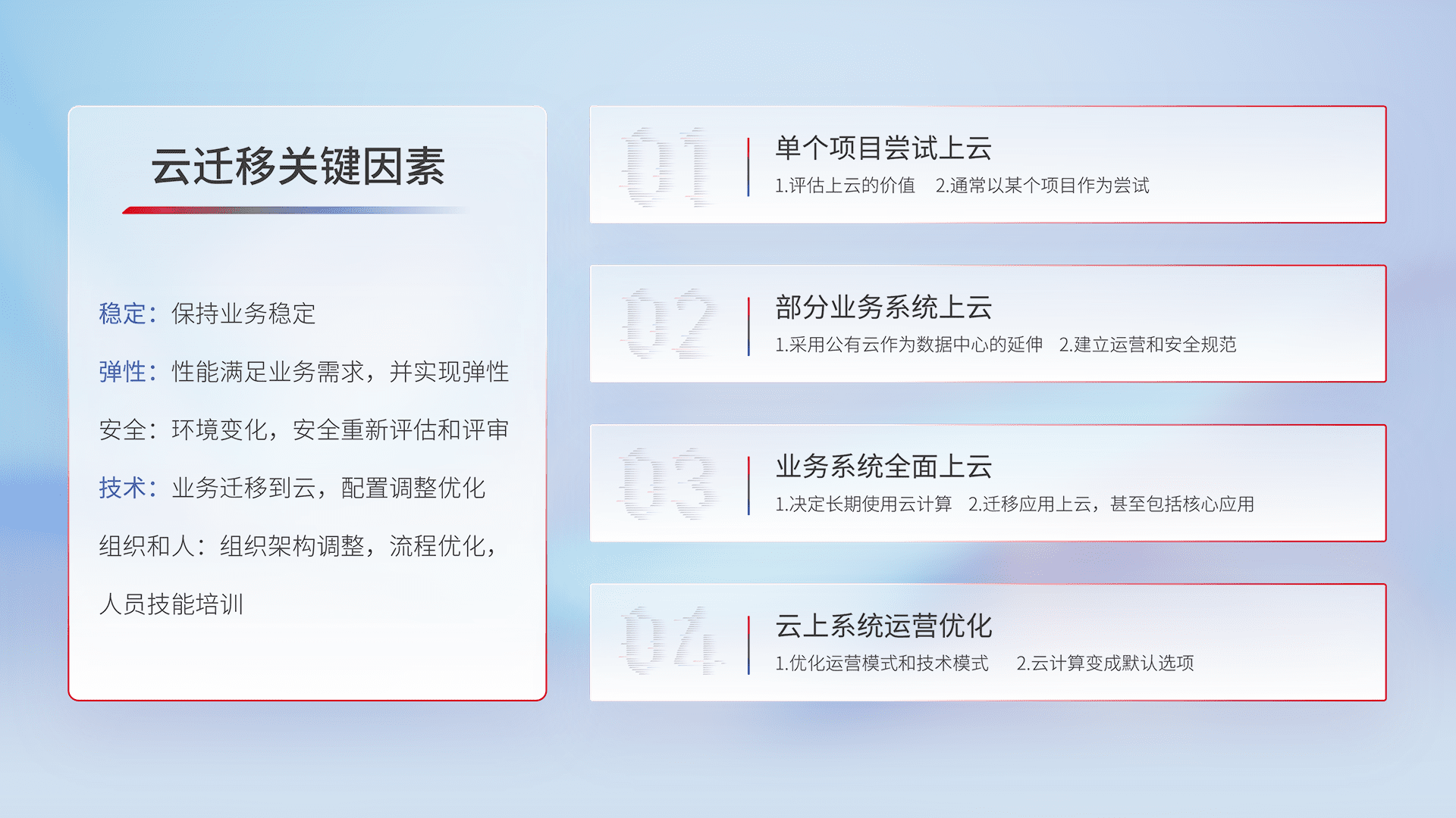 结合实际业务,,从规划设计、、、云平台选型、、、云原生改造、、、、数据迁移、、集成交付,,迁移全过程为客户识别最佳上云路径,,,做好风险识别管理,,,,设计网络架构、、、、身份权限、、、安全审计合规、、、、操作审计、、、、日志审计、、、、监控告警策略、、、多站点容灾设计等,,对云上基础设施进行整体规划,,,,提升IT治理水平,,以满足弹性、、、、高可用、、、、高性能的需求。。